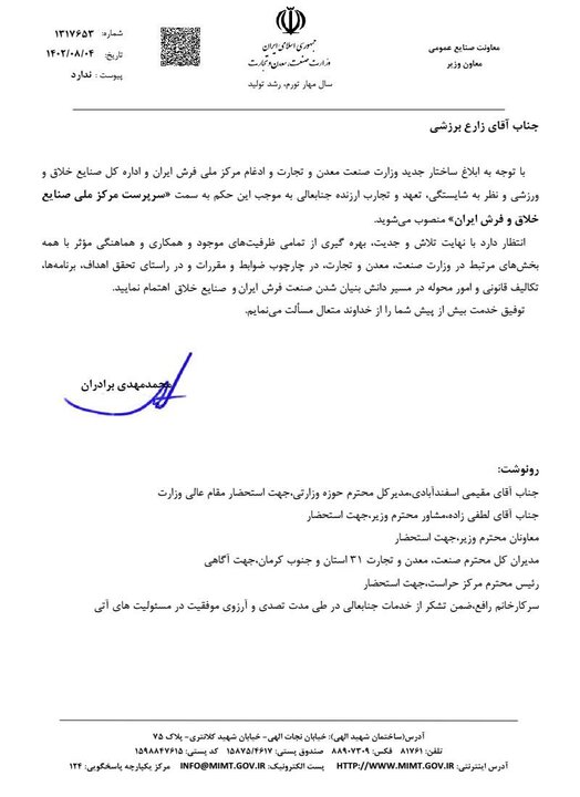 در نامه برادران معاون صنایع عمومی وزیر صمت خطاب به زارع برزشی سرپرست مرکز ملی صنایع خلاق و فرش ایران آمده است: با توجه به ابلاغ ساختار جدید وزارت صنعت معدن و تجارت و ادغام مرکز ملی فرش ایران و اداره کل صنایع خلاق و ورزشی و نظر به شایستگی تعهد و تجارب ارزنده جنابعالی به موجب این حکم به سمت سرپرست مرکز ملی صنایع خلاق و فرش ایران منصوب میشوید.