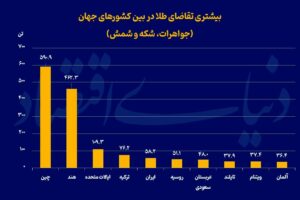 در مقابل، مصرف طلا در صنعت جواهرات برای ششمین دوره متوالی کاهش دو‌رقمی داشت و با افت محسوس به ۳۷۱ تن رسید. با وجود این، به دلیل رشد قیمت، ارزش دلاری بازار جواهرات ۱۳ درصد بالا رفت و به ۴۱‌میلیارد دلار رسید. تقاضای صنعتی (بیشتر در فناوری) نیز اندکی کاهش یافت؛ هرچند افزایش کاربرد طلا در فناوری هوش مصنوعی تا حدی این افت را جبران کرد، اما تعرفه‌های آمریکا و افزایش قیمت مانع رشد بیشتر شدند. در ایران نیز تقاضای طلا در بخش جواهرات، در ۹ ماه نخست ۲۰۲۵ معادل ۲۱ تن و تقاضای شمش و سکه بیش از ۳۷ تن بود که مجموعا خرید ۵۸ درصدی طلا را برای ایران به ثبت رساند. این رقم، ایران را در رتبه پنجم تقاضای طلا در جهان قرار داد.